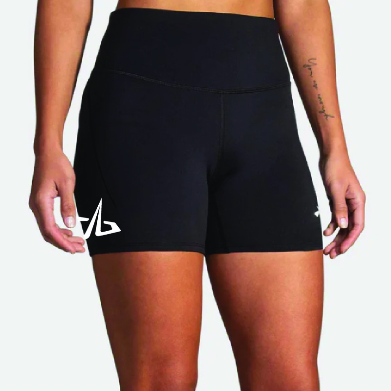 Black Brooks shorts with a white REVEL logo. Men's Shorts are a lightweight running short. Women's Shorts are a black compression short.