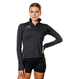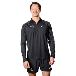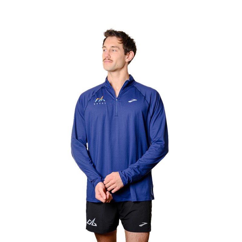 Brooks long sleeve half zip shirt with Revel logo. Men's and women's sizing.