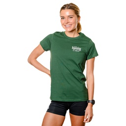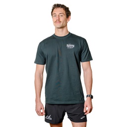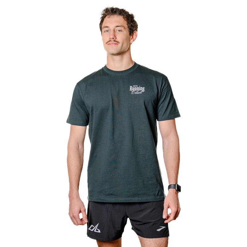 A dark green tri-blend t-shirt with simple REVEL Running Club design on the front corner. Mens & women's sizing.