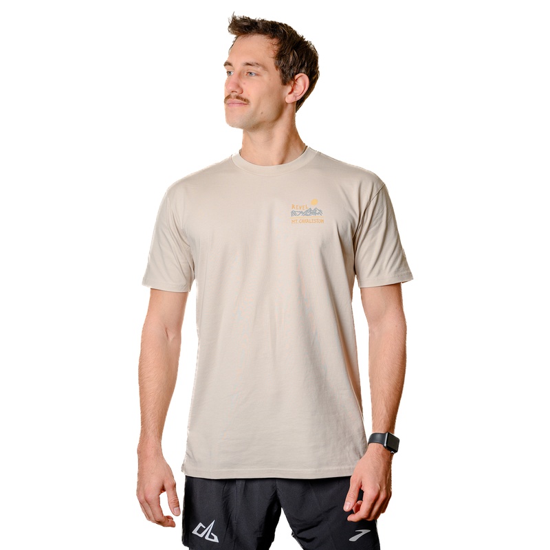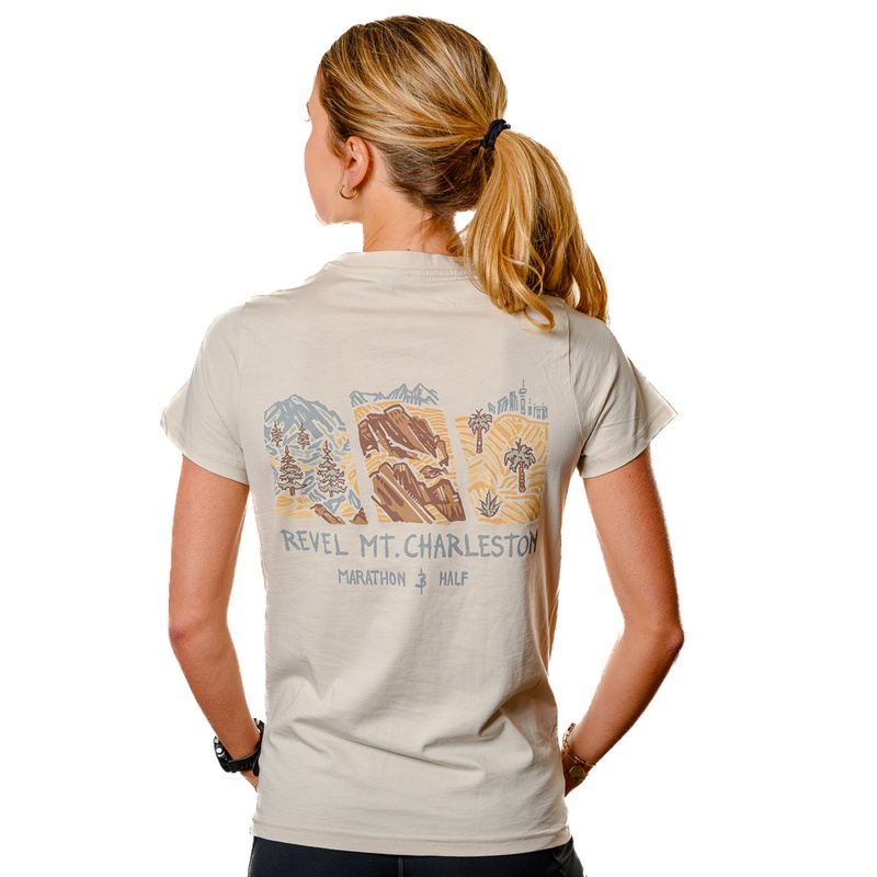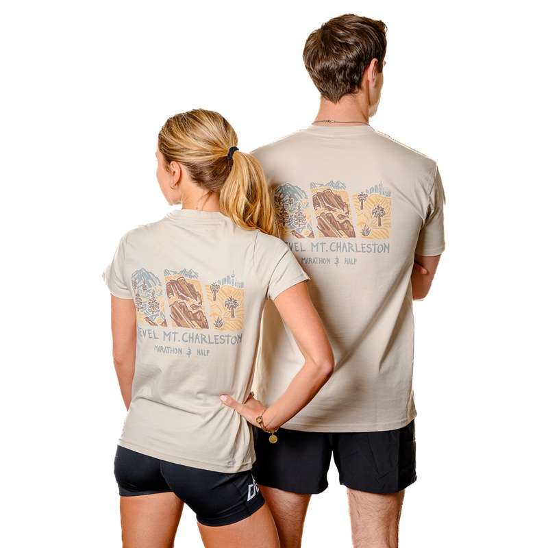 A super soft cream tri-blend t-shirt with three panels representing your Peak to Desert Mt Charleston run. Mens & women's sizing.
