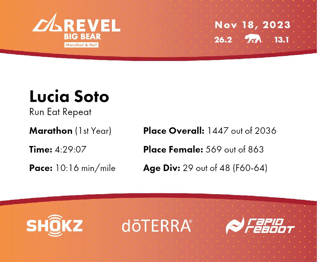 | Finish | 26.2 | 4:29:07 | 10:16/miles | 1.2 | 15:21 | 12:47/miles | 1447 | 569 F | 29 F60-64 |