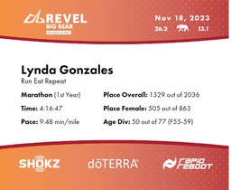 | Mile 25 | 25.0 | 4:04:48 | 9:47/miles | 1.0 | 9:34 | 9:33/miles | 1325 | 508 F | 51 F55-59 |