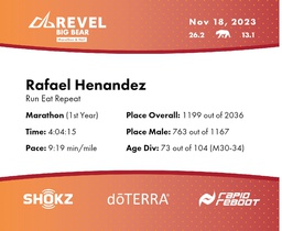 | Finish | 26.2 | 4:04:15 | 9:19/miles | 1.2 | 12:54 | 10:44/miles | 1199 | 763 M | 73 M30-34 |