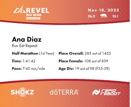 | Finish | 13.1 | 1:41:42 | 7:45/miles | 1.2 | 10:24 | 8:39/miles | 285 | 108 F | 19 F35-39 |