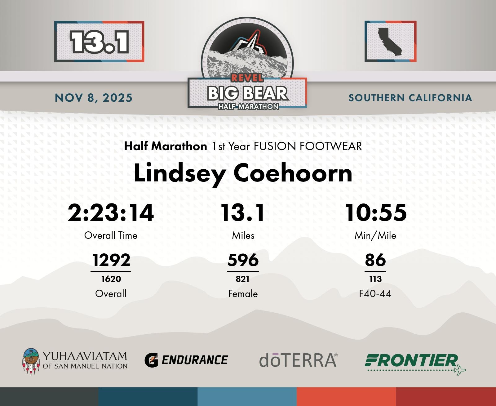 Date: November 8, 2025 Participant: Lindsey Coehoorn #1532 Race: 2025 REVEL Big Bear Half Marathon Distance: 13.1 miles