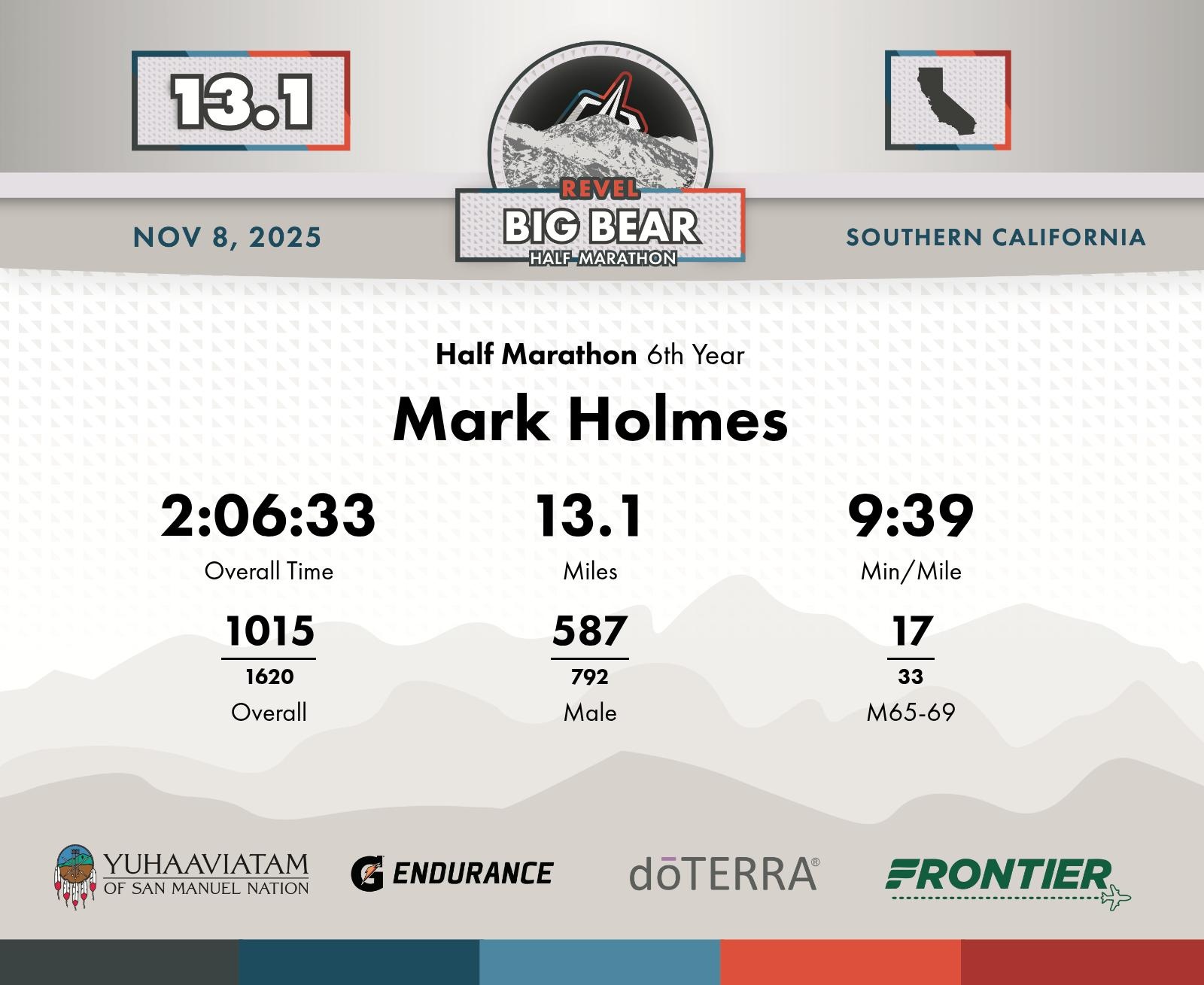Date: November 8, 2025 Participant: Mark Holmes #1081 Race: 2025 REVEL Big Bear Half Marathon Distance: 13.1 miles