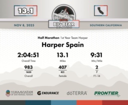 Date: November 8, 2025 Participant: Harper Spain #2479 Race: 2025 REVEL Big Bear Half Marathon Distance: 13.1 miles