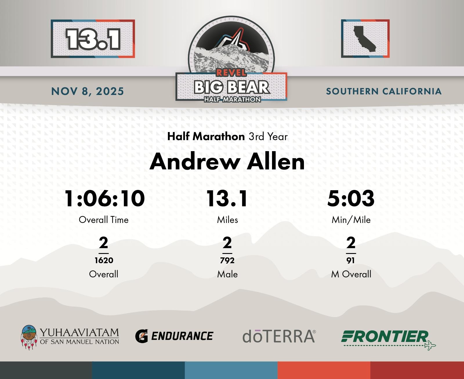 Date: November 8, 2025 Participant: Andrew Allen #1310 Race: 2025 REVEL Big Bear Half Marathon Distance: 13.1 miles