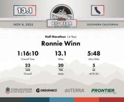 Date: November 8, 2025 Participant: Ronnie Winn #2787 Race: 2025 REVEL Big Bear Half Marathon Distance: 13.1 miles