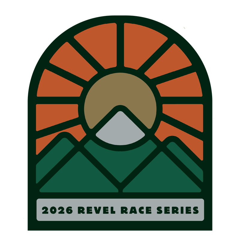 Everyone needs a REVEL sticker on their favorite water bottle! Stained glass mountain sunset design with all four 2026 Revel races listed around the border.