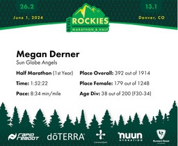 | Finish | 13.1 | 1:52:22 | 8:34/miles | 1.0 | 9:07 | 9:06/miles | 392 | 179 F | 38 F30-34 |