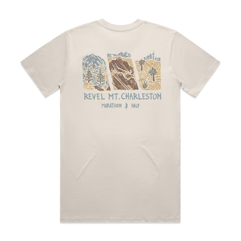 A super soft cream tri-blend t-shirt with three panels representing your Peak to Desert Mt Charleston run. Mens & women's sizing.