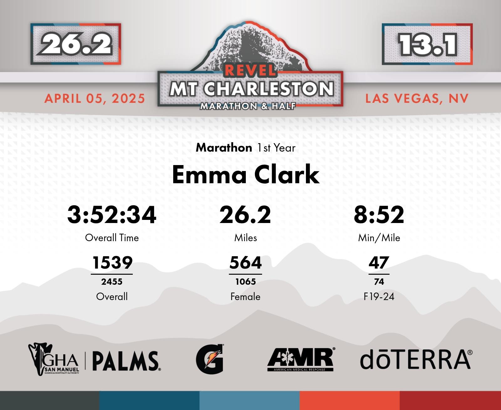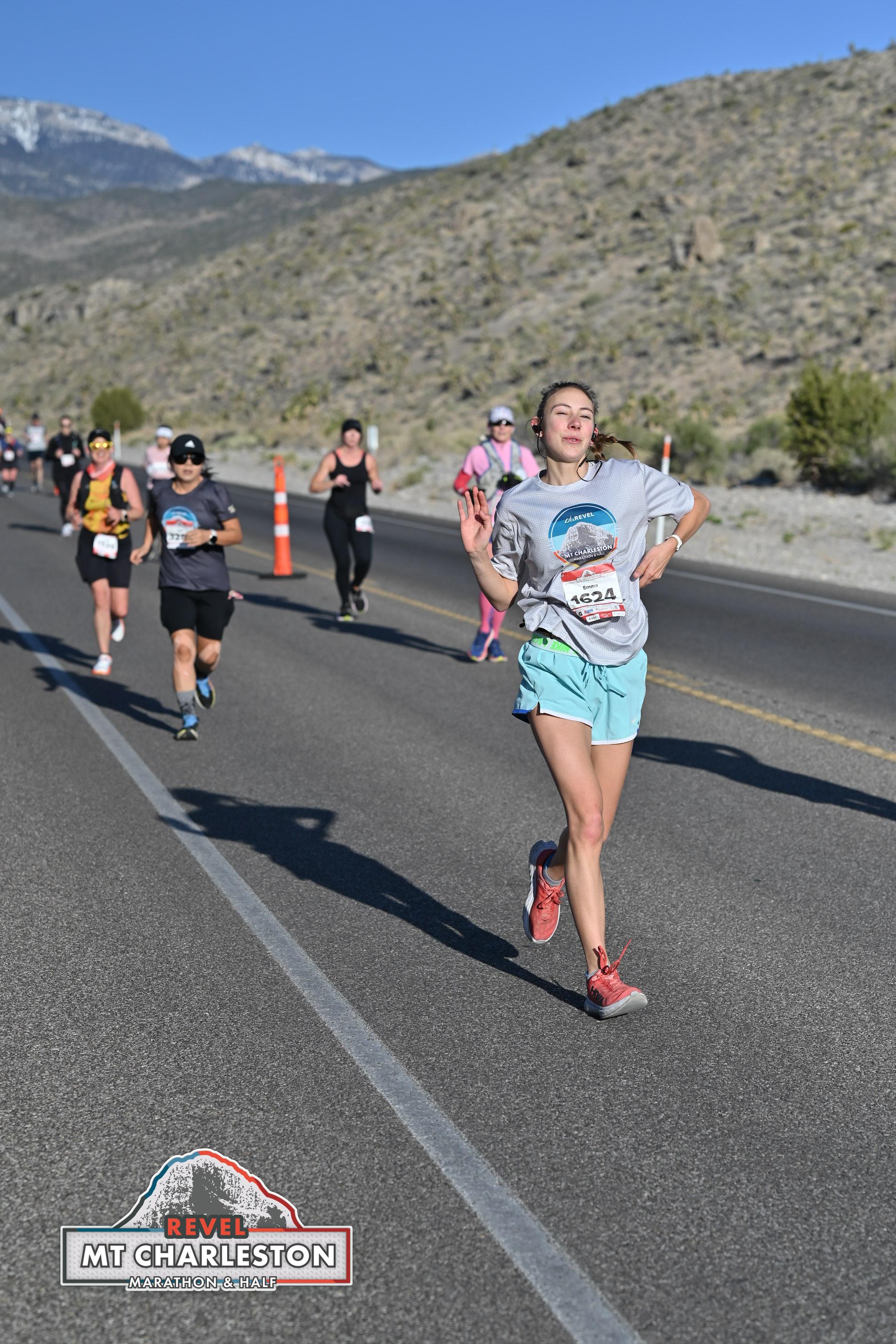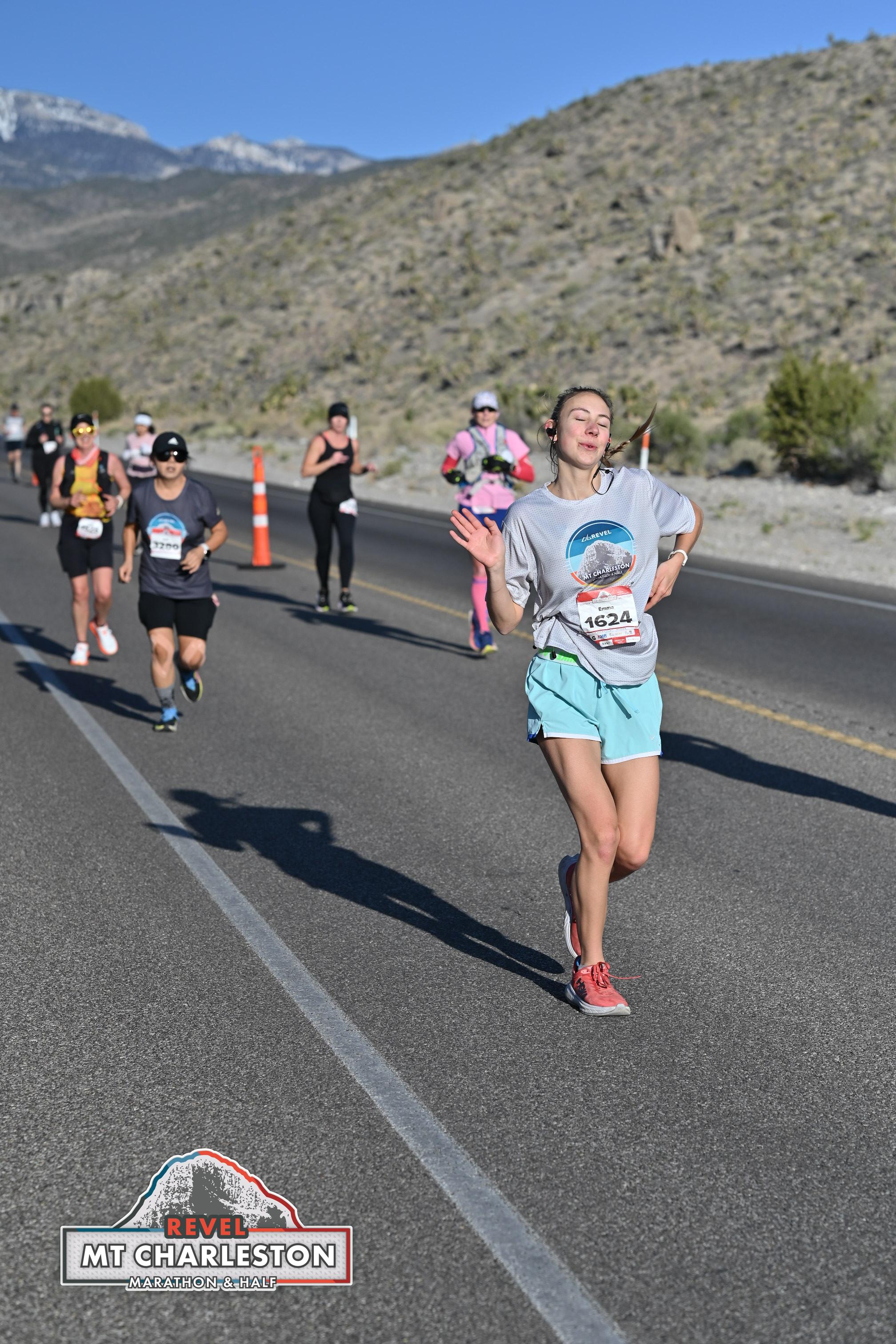 Date: April 5, 2025 Participant: Emma Clark #1624 Race: 2025 REVEL Mt Charleston Marathon Distance: 26.2 miles Weather: Chilly start. Heavy winds (tail/cross wind). Sunny at the finish.