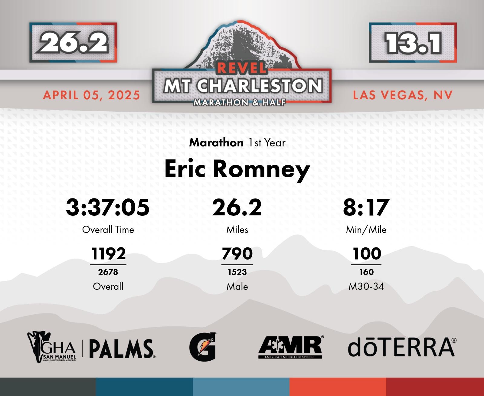 Date: April 5, 2025 Participant: Eric Romney #3146 Race: 2025 REVEL Mt Charleston Marathon Distance: 26.2 miles Weather: Chilly start. Heavy winds (tail/cross wind). Sunny at the finish.