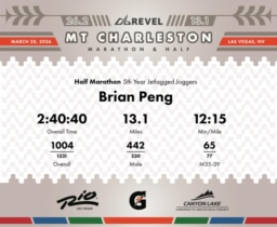 Date: March 28, 2026 Participant: Brian Peng #1973 Race: 2026 REVEL Mt Charleston Half Marathon Distance: 13.1 miles Weather: Unseasonably warm. Nice running temperatures at the start.