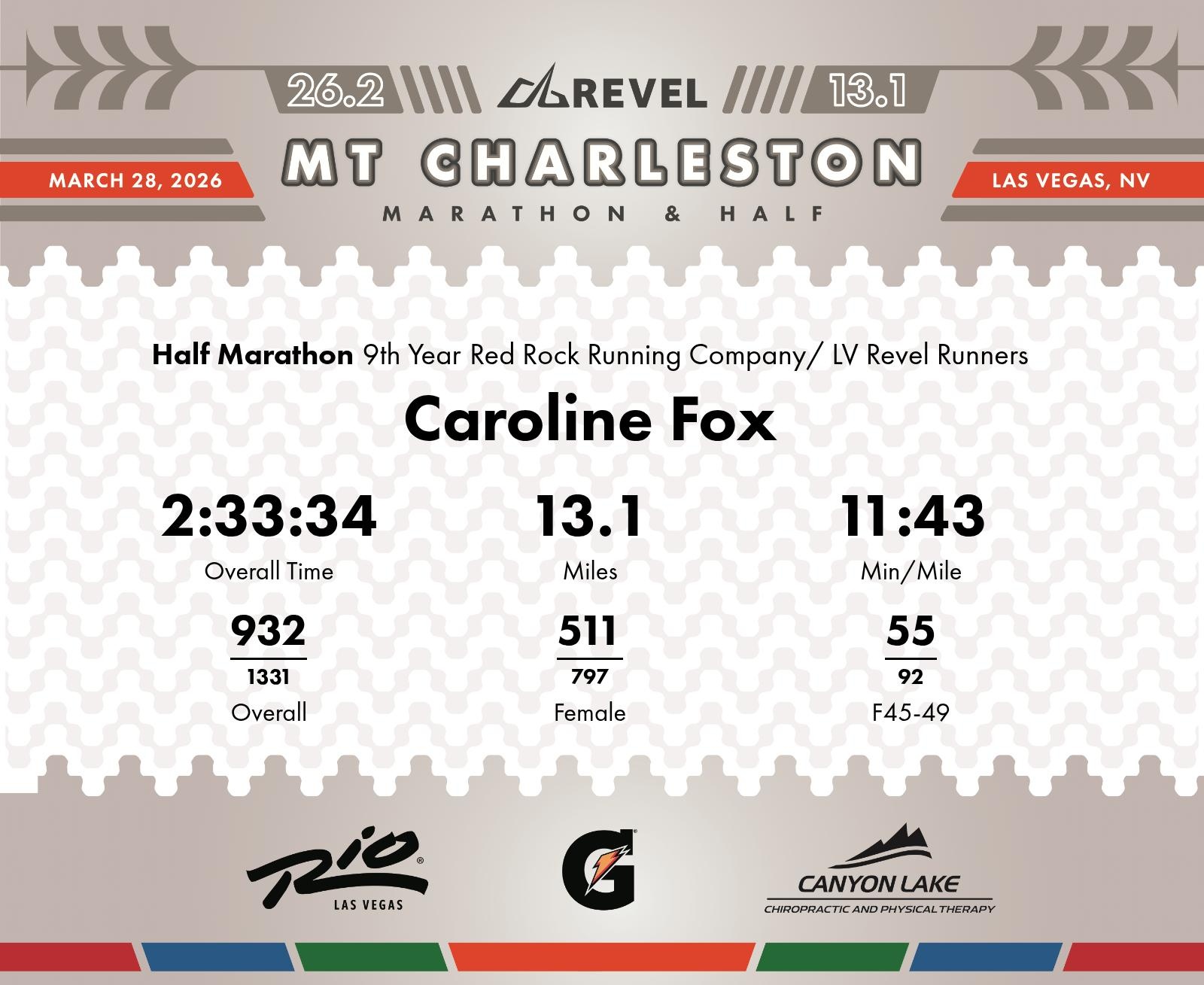 Date: March 28, 2026 Participant: Caroline Fox #1480 Race: 2026 REVEL Mt Charleston Half Marathon Distance: 13.1 miles Weather: Unseasonably warm. Nice running temperatures at the start.