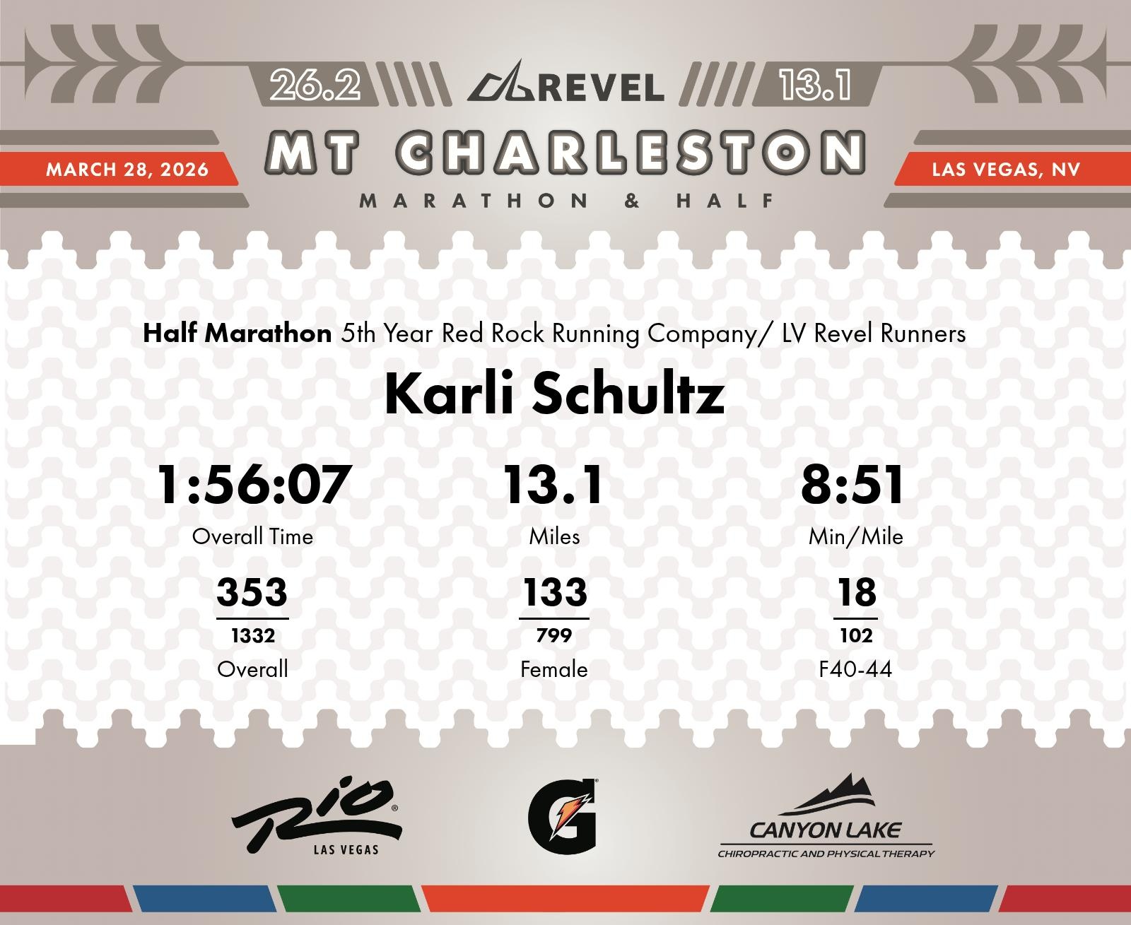 Date: March 28, 2026 Participant: Karli Schultz #2112 Race: 2026 REVEL Mt Charleston Half Marathon Distance: 13.1 miles Weather: Unseasonably warm. Nice running temperatures at the start.