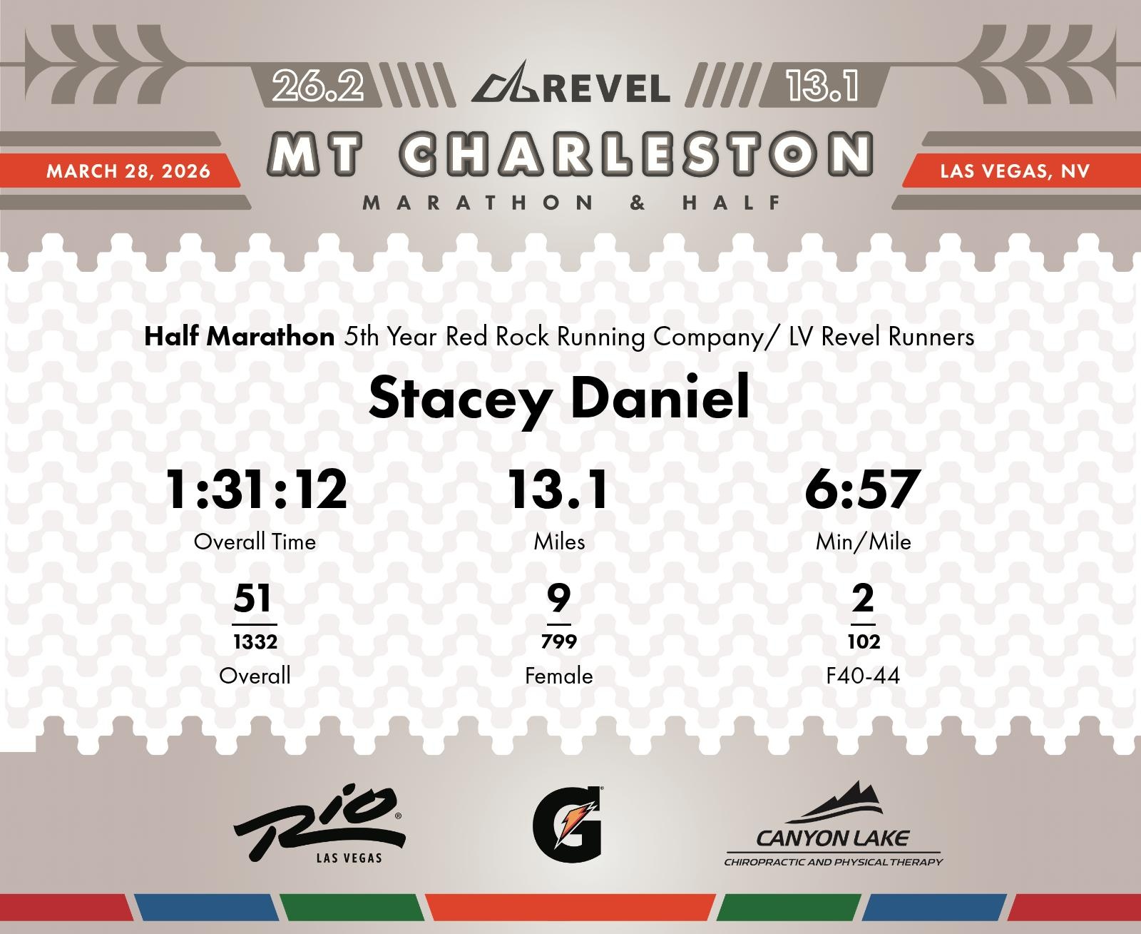 Date: March 28, 2026 Participant: Stacey Daniel #1369 Race: 2026 REVEL Mt Charleston Half Marathon Distance: 13.1 miles Weather: Unseasonably warm. Nice running temperatures at the start.