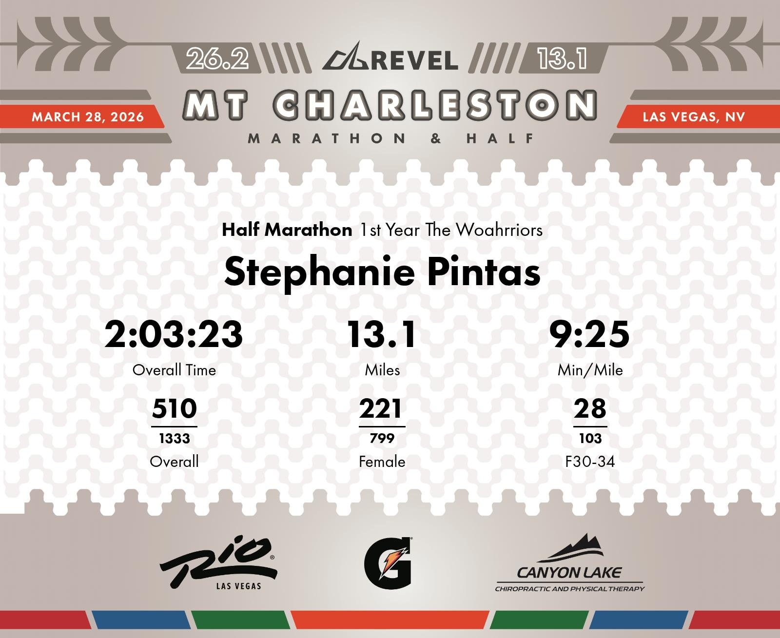 Date: March 28, 2026 Participant: Stephanie Pintas #1994 Race: 2026 REVEL Mt Charleston Half Marathon Distance: 13.1 miles Weather: Unseasonably warm. Nice running temperatures at the start.