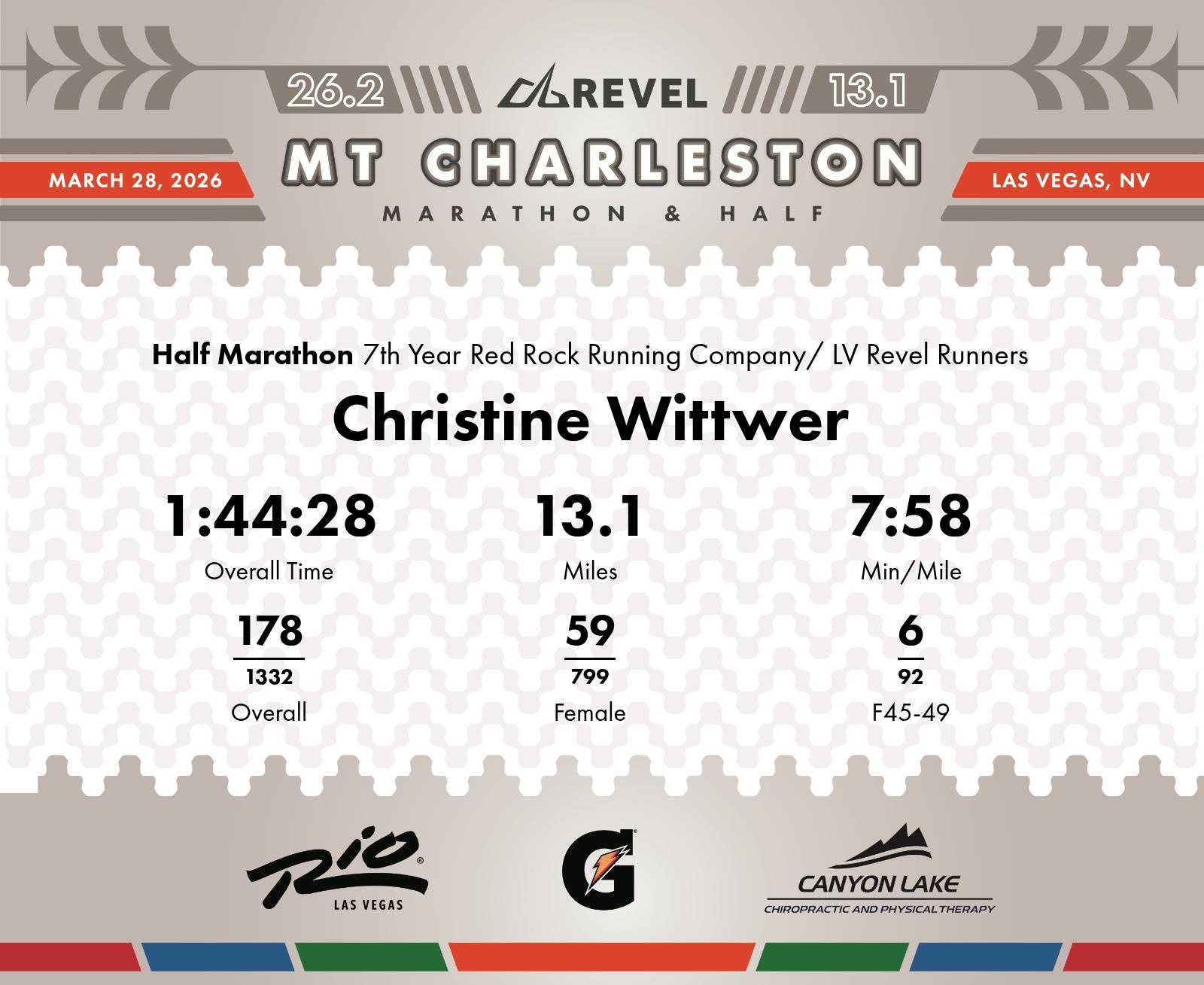 Date: March 28, 2026 Participant: Christine Wittwer #2309 Race: 2026 REVEL Mt Charleston Half Marathon Distance: 13.1 miles Weather: Unseasonably warm. Nice running temperatures at the start.