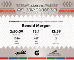 Date: March 28, 2026 Participant: Ronald Morgan #1886 Race: 2026 REVEL Mt Charleston Half Marathon Distance: 13.1 miles Weather: Unseasonably warm. Nice running temperatures at the start.