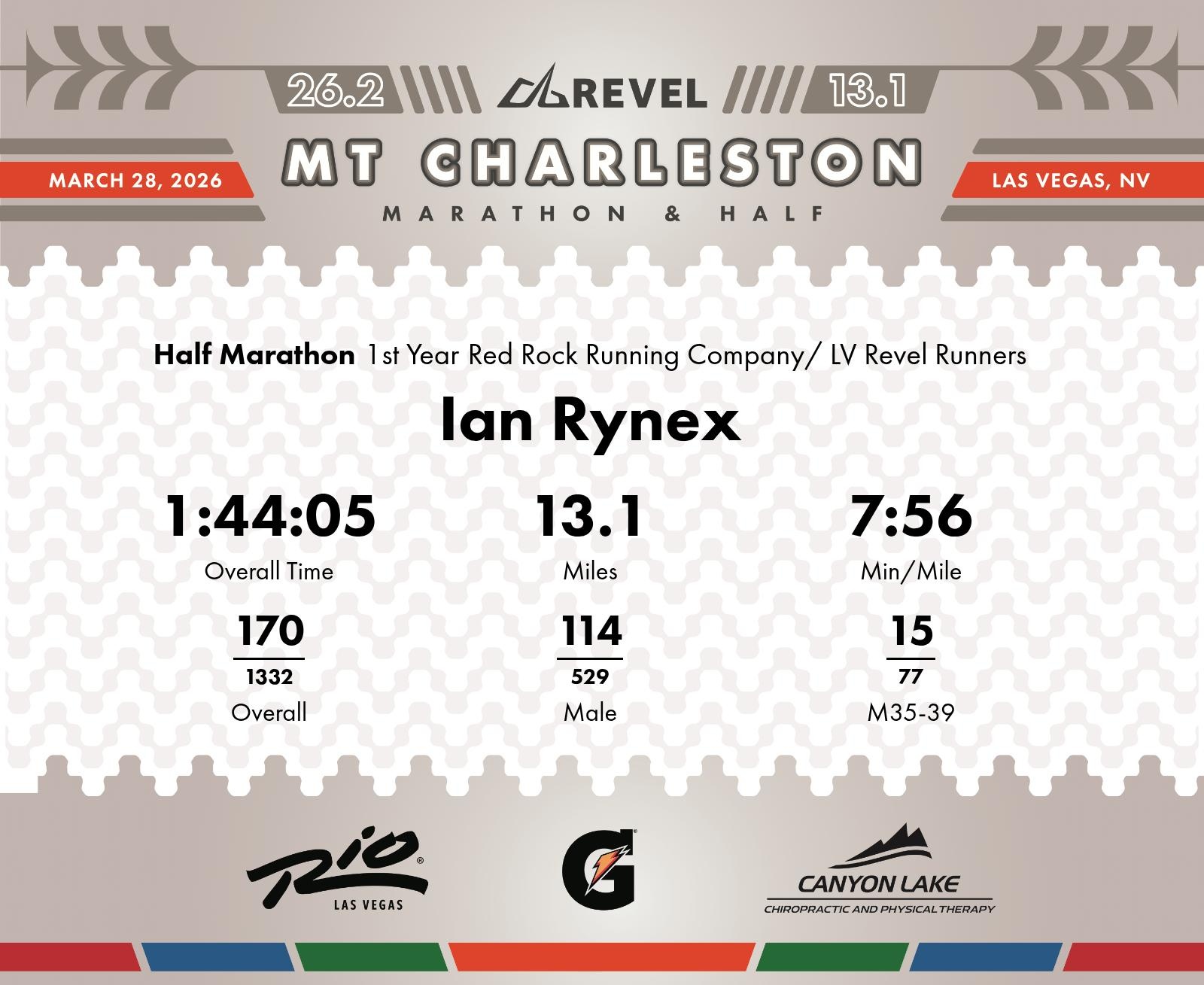 Consistent Performance with a Strong Finish Ian Rynex, representing Red Rock Running Company/ LV Revel Runners, completed the 2026 REVEL Mt Charleston Half Marathon with an overall time of 1:44:05, averaging a pace of 7:56 min/mile. Throughout the race, there was a stable performance with significant consistency in pacing across most miles. Notably, Mile 6 and the final Mile 13 showed faster split paces at 7:14 and 7:33 min/mile respectively, indicating strong segments during the race. Starting at a 7:42 min/mile pace for his first mile, Ian maintained a balanced rhythm for much of the course. Despite minor pace fluctuations, his consistency and pace improvement in key segments like Mile 6 helped in securing a respectable finish in his division, placing 16th. It's worth mentioning his ranks improved towards the end, moving up to 140th overall by Mile 11, showing potential for a strong finish strategy.