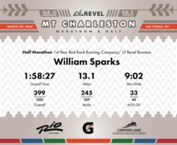 Date: March 28, 2026 Participant: William Sparks #2162 Race: 2026 REVEL Mt Charleston Half Marathon Distance: 13.1 miles Weather: Unseasonably warm. Nice running temperatures at the start.