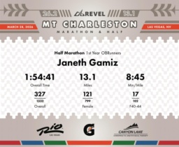 Date: March 28, 2026 Participant: Janeth Gamiz #1495 Race: 2026 REVEL Mt Charleston Half Marathon Distance: 13.1 miles Weather: Unseasonably warm. Nice running temperatures at the start.