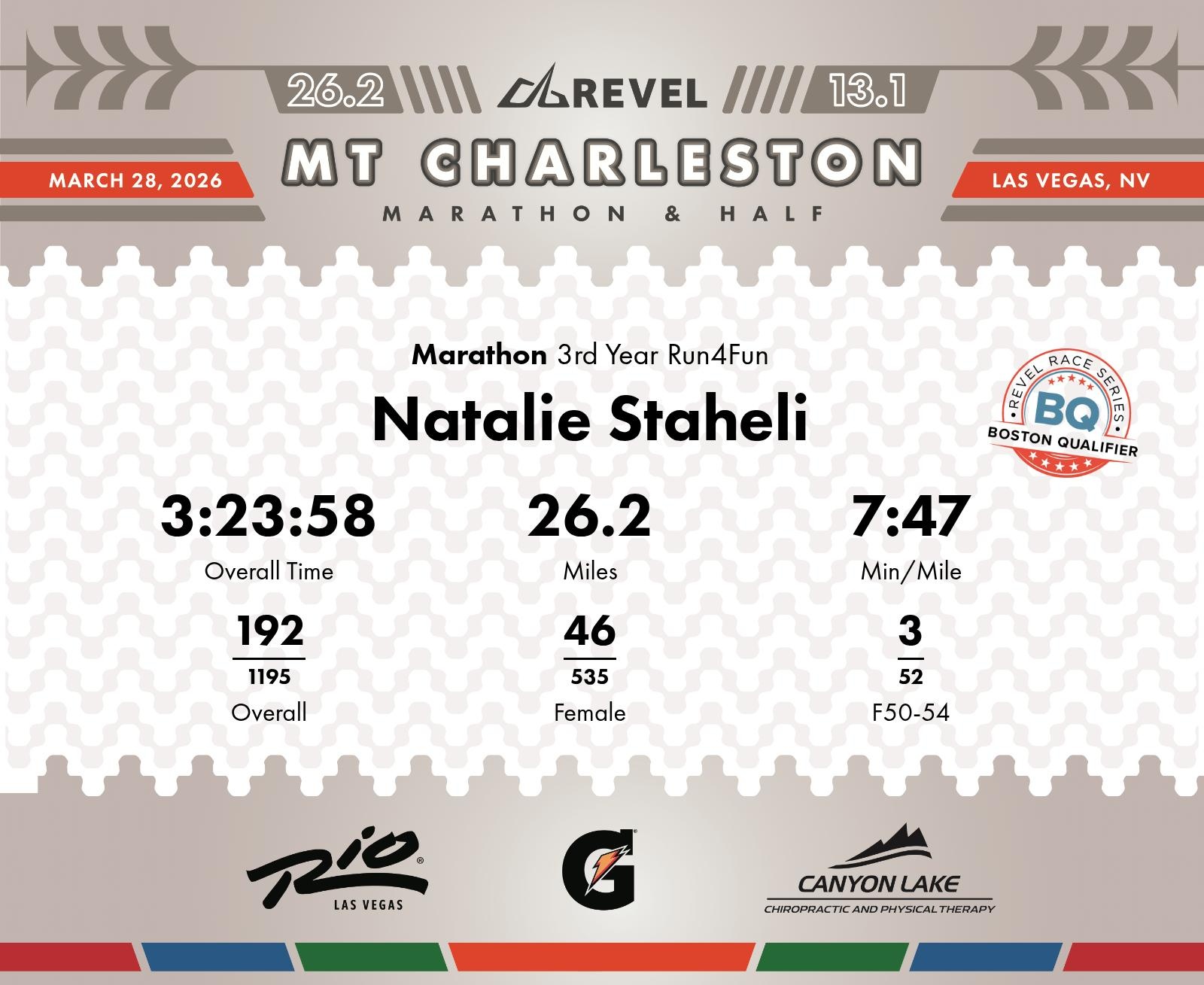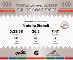 Date: March 28, 2026 Participant: Natalie Staheli #3806 Race: 2026 REVEL Mt Charleston Marathon Distance: 26.2 miles Weather: Unseasonably warm. Nice running temperatures at the start.