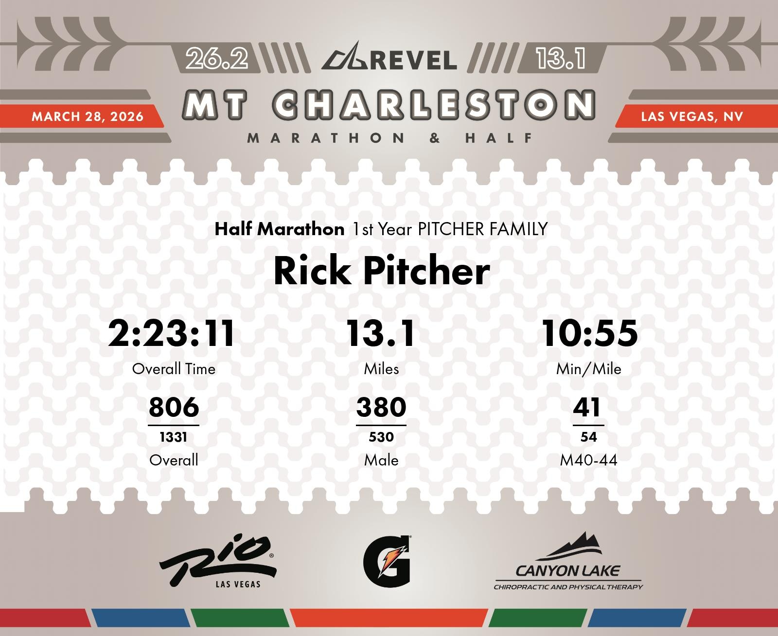 Date: March 28, 2026 Participant: Rick Pitcher #2000 Race: 2026 REVEL Mt Charleston Half Marathon Distance: 13.1 miles Weather: Unseasonably warm. Nice running temperatures at the start.