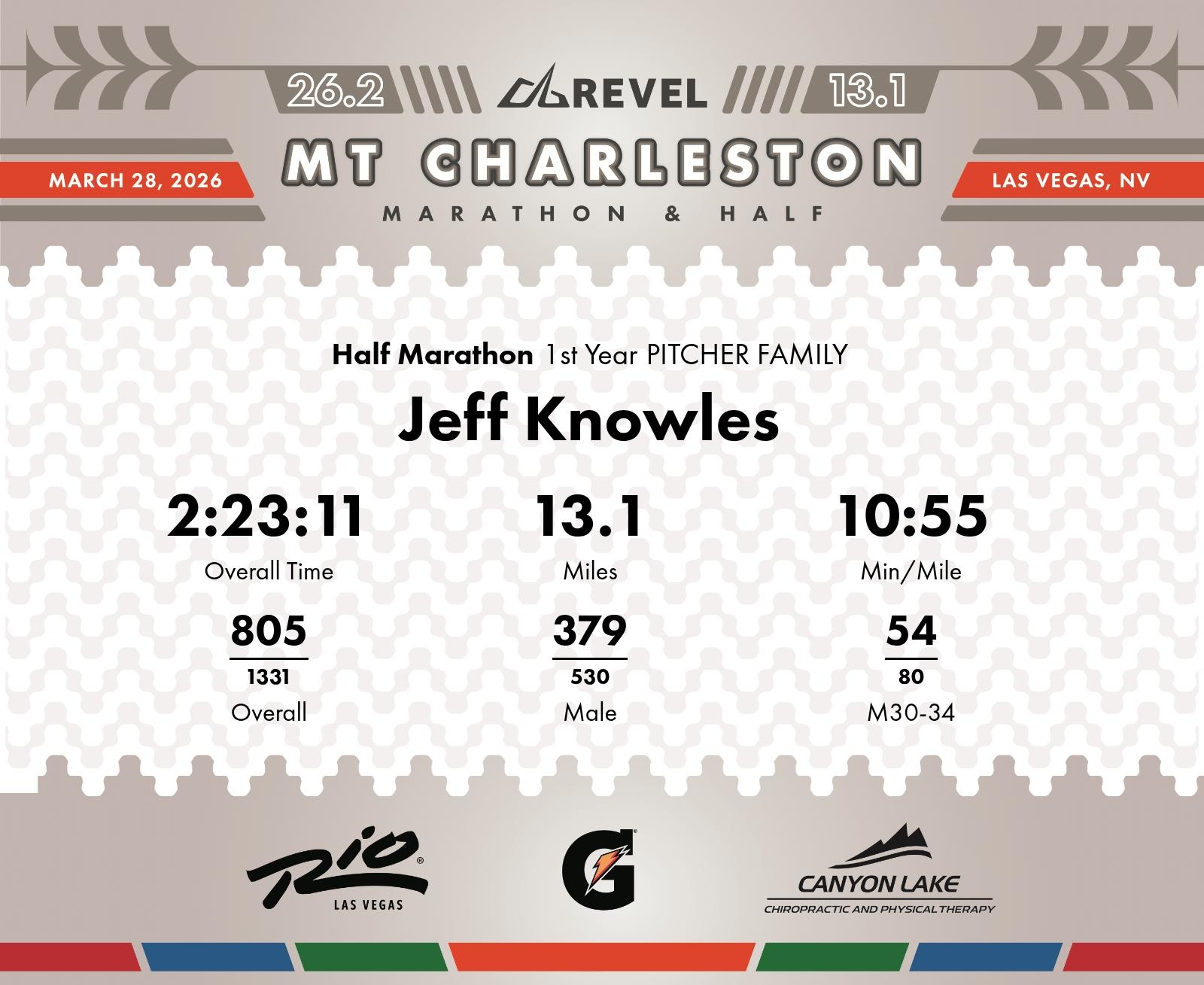 Date: March 28, 2026 Participant: Jeff Knowles #1691 Race: 2026 REVEL Mt Charleston Half Marathon Distance: 13.1 miles Weather: Unseasonably warm. Nice running temperatures at the start.