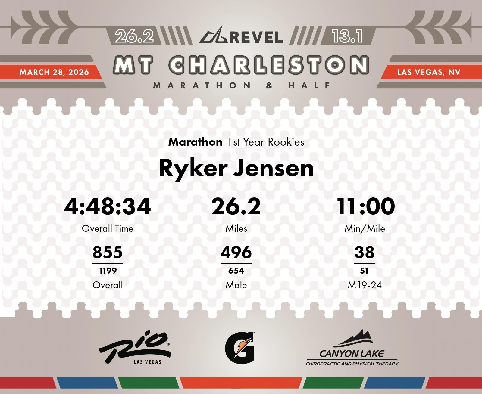 Date: March 28, 2026 Participant: Ryker Jensen #3236 Race: 2026 REVEL Mt Charleston Marathon Distance: 26.2 miles Weather: Unseasonably warm. Nice running temperatures at the start.