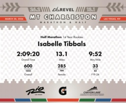 Date: March 28, 2026 Participant: Isabelle Tibbals #2208 Race: 2026 REVEL Mt Charleston Half Marathon Distance: 13.1 miles Weather: Unseasonably warm. Nice running temperatures at the start.