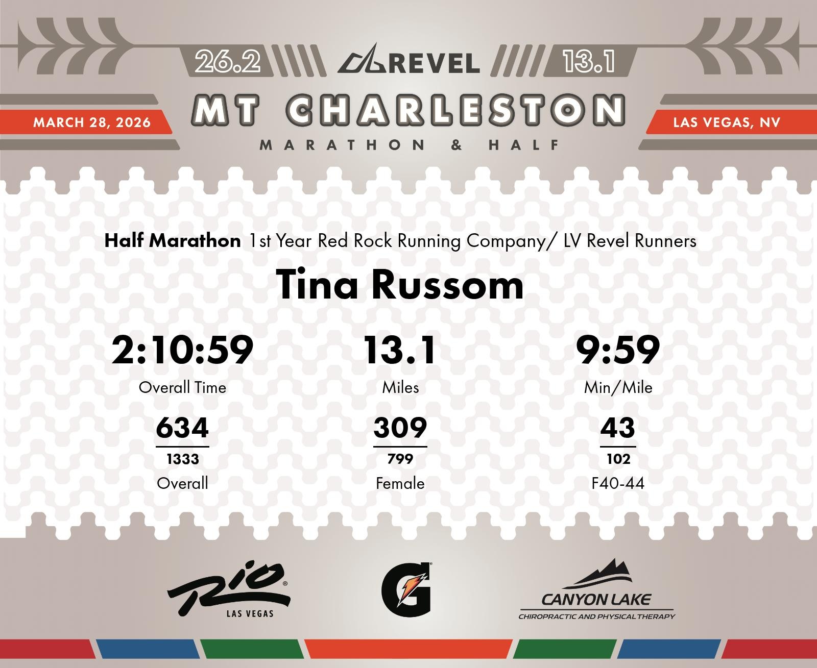 Date: March 28, 2026 Participant: Tina Russom #4391 Race: 2026 REVEL Mt Charleston Half Marathon Distance: 13.1 miles Weather: Unseasonably warm. Nice running temperatures at the start.
