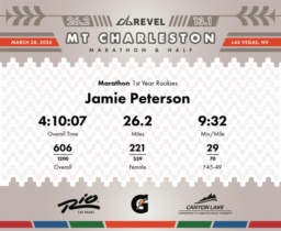 Date: March 28, 2026 Participant: Jamie Peterson #3598 Race: 2026 REVEL Mt Charleston Marathon Distance: 26.2 miles Weather: Unseasonably warm. Nice running temperatures at the start.