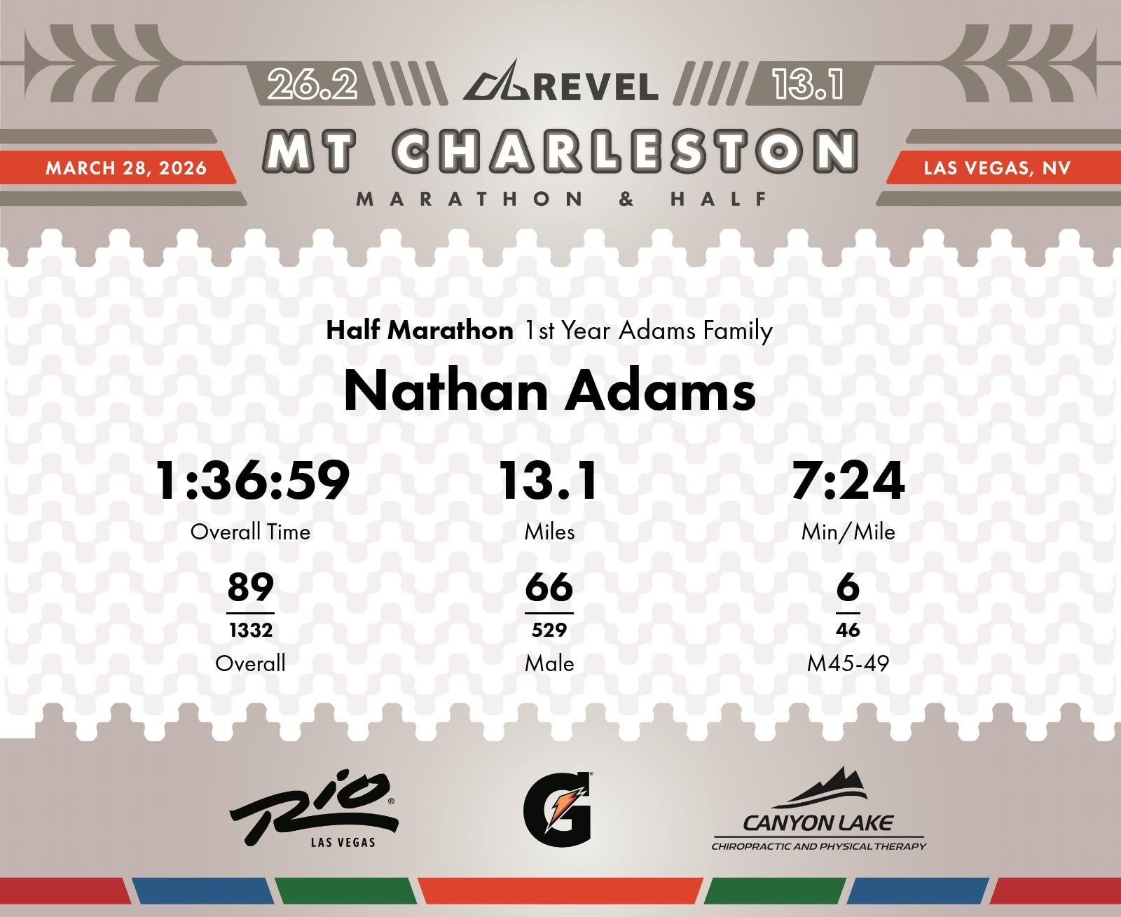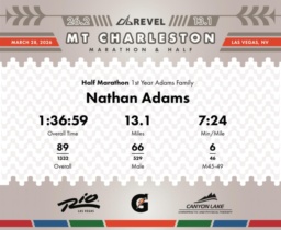 Date: March 28, 2026 Participant: Nathan Adams #1004 Race: 2026 REVEL Mt Charleston Half Marathon Distance: 13.1 miles Weather: Unseasonably warm. Nice running temperatures at the start.