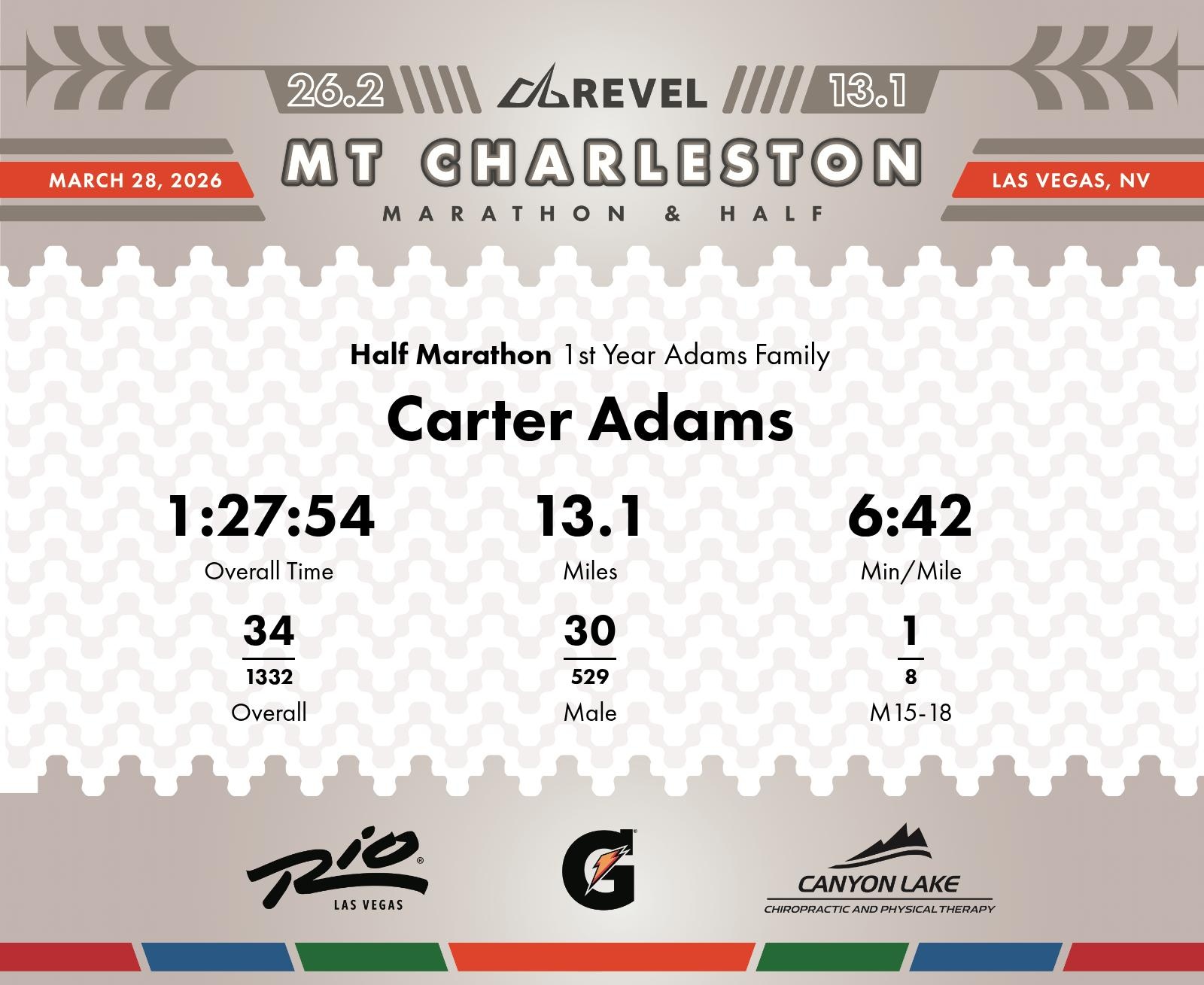 Date: March 28, 2026 Participant: Carter Adams #1001 Race: 2026 REVEL Mt Charleston Half Marathon Distance: 13.1 miles Weather: Unseasonably warm. Nice running temperatures at the start.