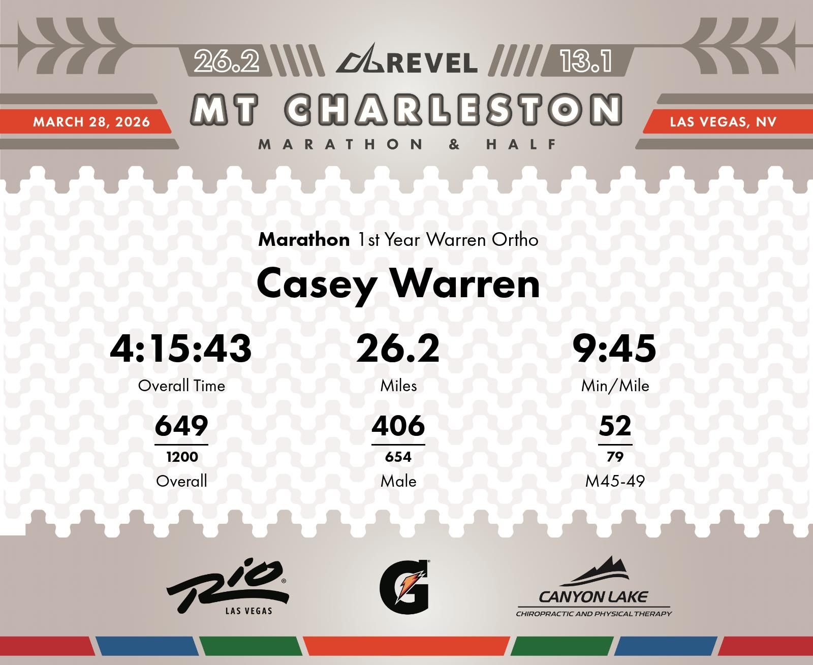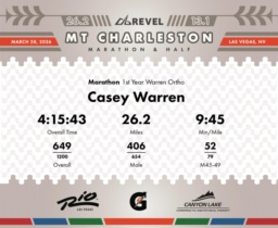 Date: March 28, 2026 Participant: Casey Warren #3950 Race: 2026 REVEL Mt Charleston Marathon Distance: 26.2 miles Weather: Unseasonably warm. Nice running temperatures at the start.