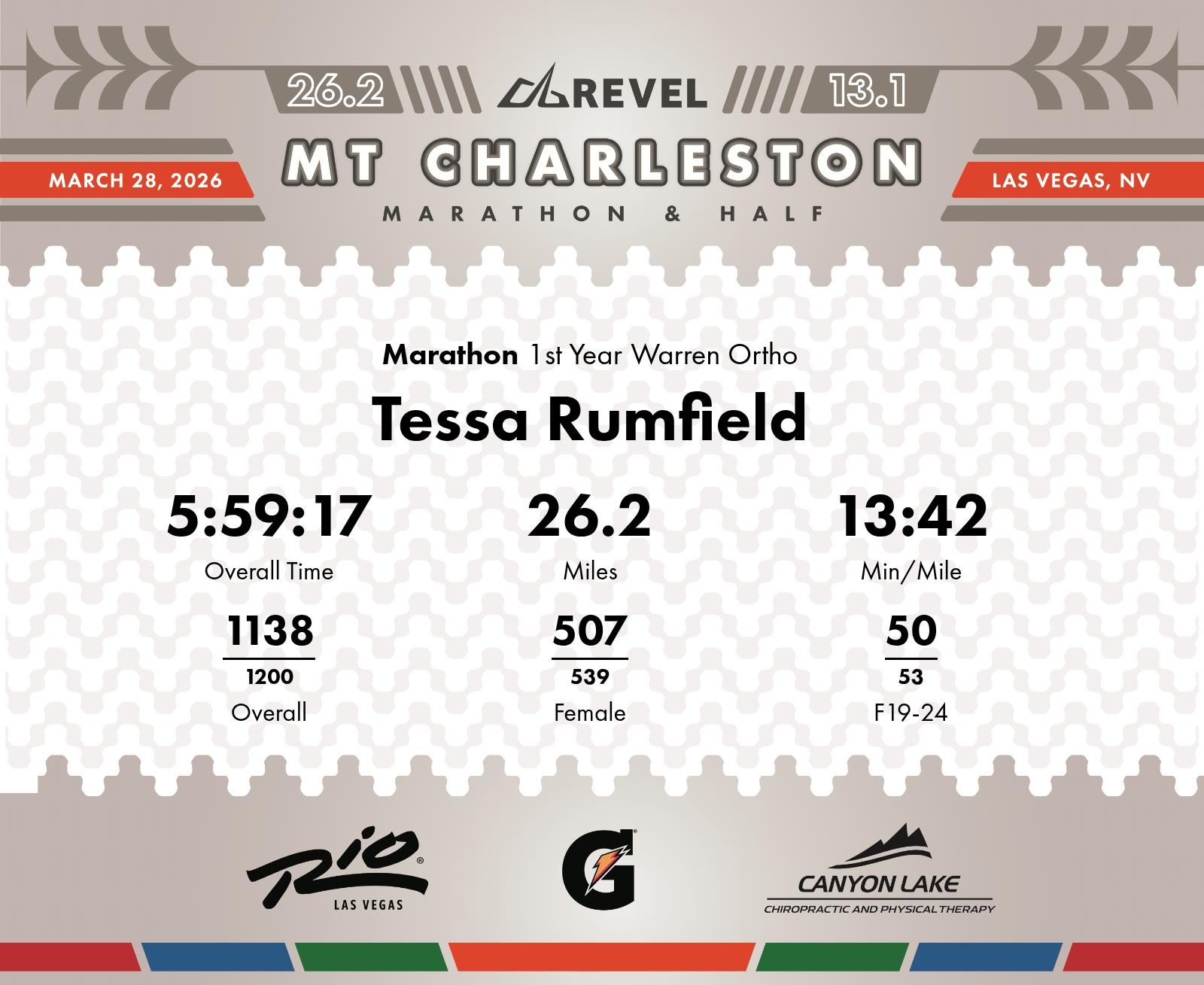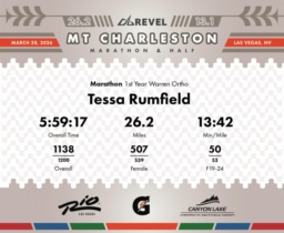 Date: March 28, 2026 Participant: Tessa Rumfield #3708 Race: 2026 REVEL Mt Charleston Marathon Distance: 26.2 miles Weather: Unseasonably warm. Nice running temperatures at the start.