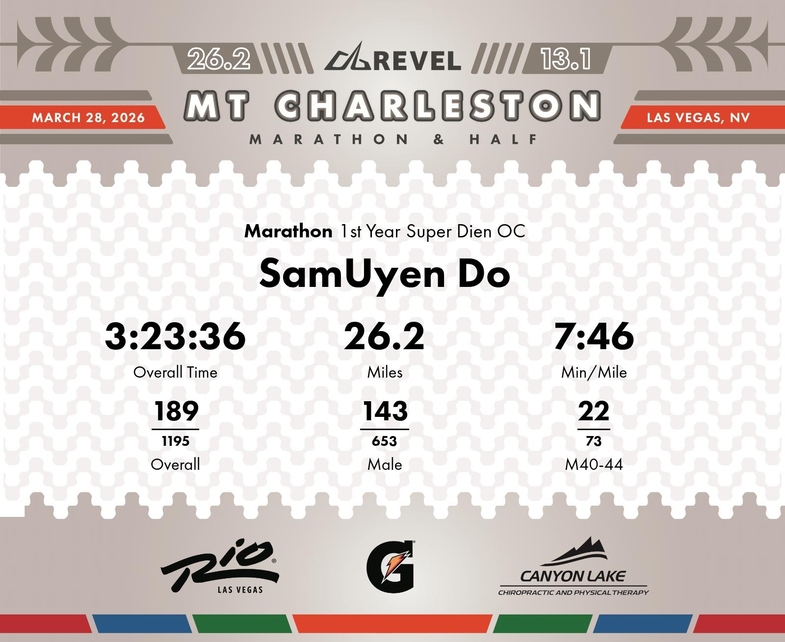 Date: March 28, 2026 Participant: SamUyen Do #3002 Race: 2026 REVEL Mt Charleston Marathon Distance: 26.2 miles Weather: Unseasonably warm. Nice running temperatures at the start.