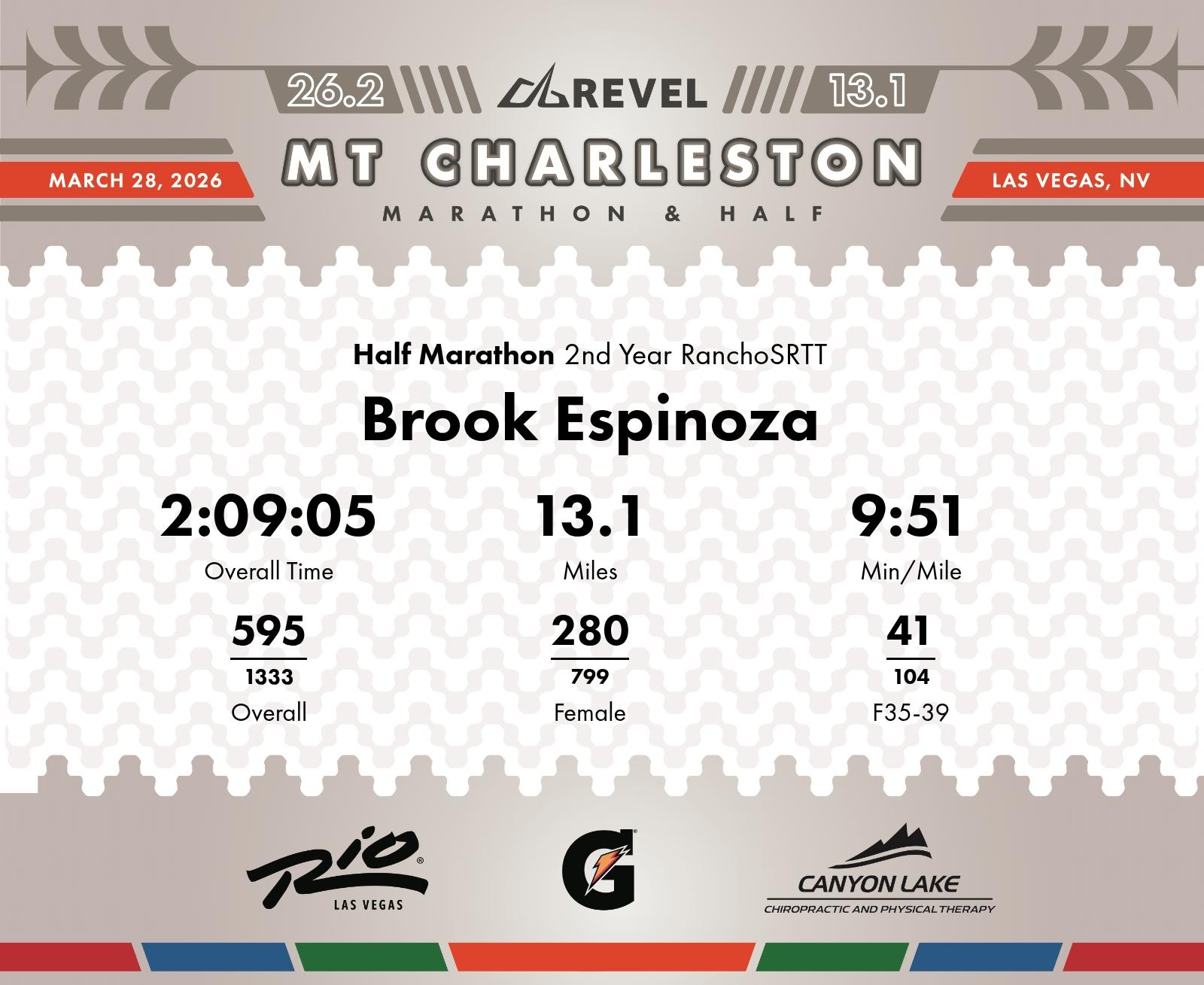 Date: March 28, 2026 Participant: Brook Espinoza #1431 Race: 2026 REVEL Mt Charleston Half Marathon Distance: 13.1 miles Weather: Unseasonably warm. Nice running temperatures at the start.