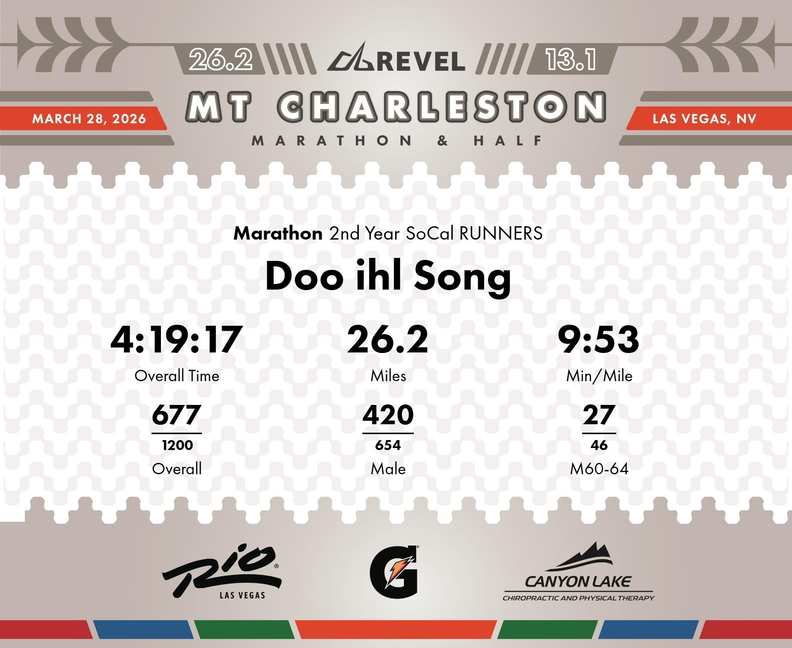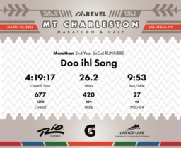 Date: March 28, 2026 Participant: Doo ihl Song #3796 Race: 2026 REVEL Mt Charleston Marathon Distance: 26.2 miles Weather: Unseasonably warm. Nice running temperatures at the start.