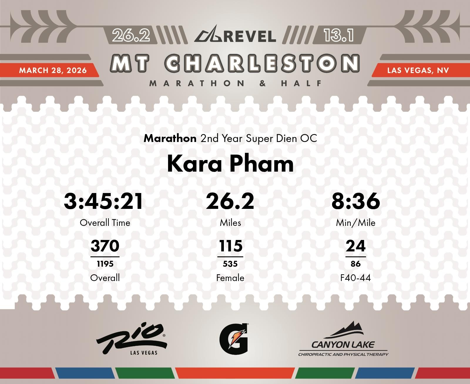 Date: March 28, 2026 Participant: Kara Pham #3600 Race: 2026 REVEL Mt Charleston Marathon Distance: 26.2 miles Weather: Unseasonably warm. Nice running temperatures at the start.