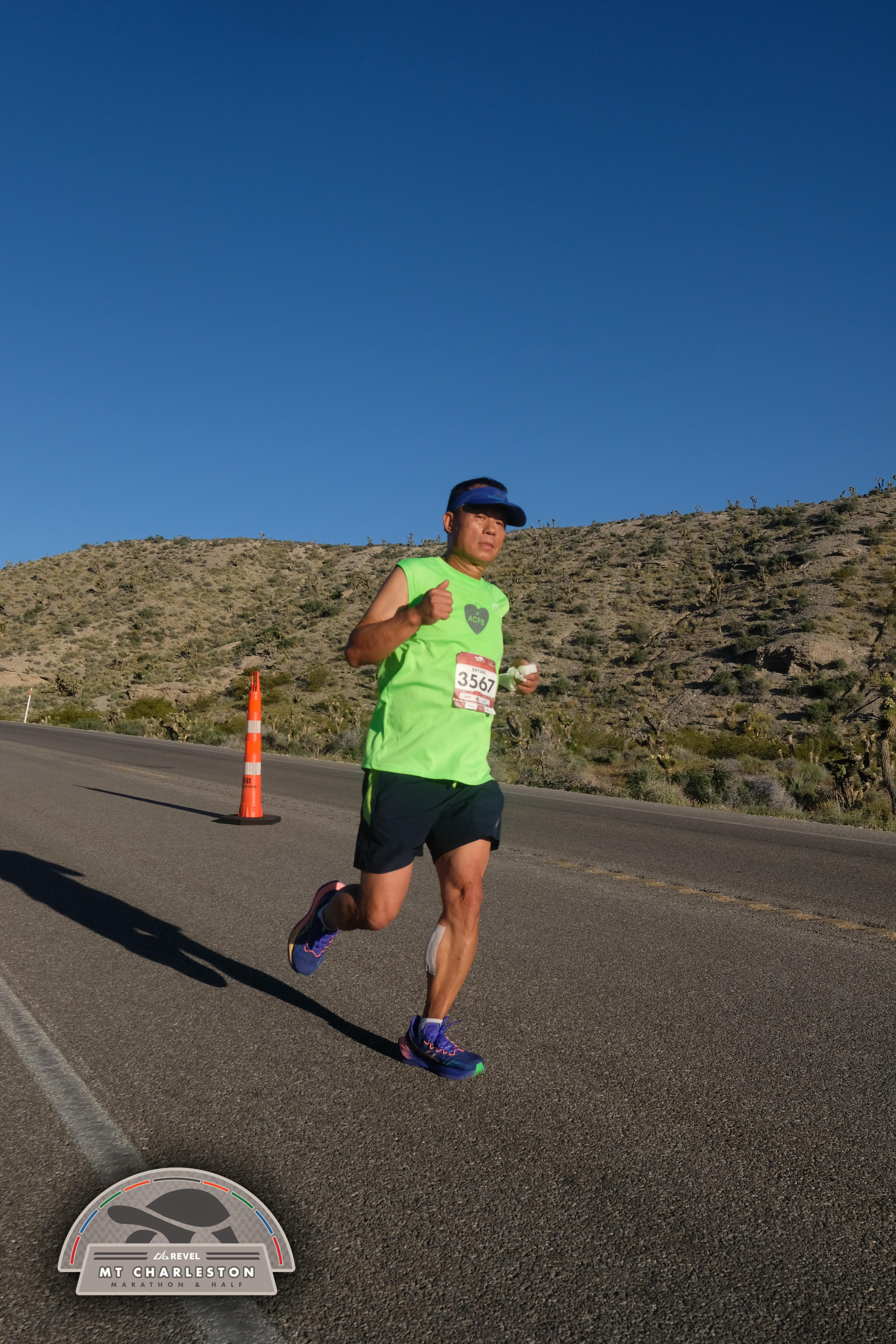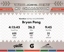 Date: March 28, 2026 Participant: Bryan Pang #3567 Race: 2026 REVEL Mt Charleston Marathon Distance: 26.2 miles Weather: Unseasonably warm. Nice running temperatures at the start.