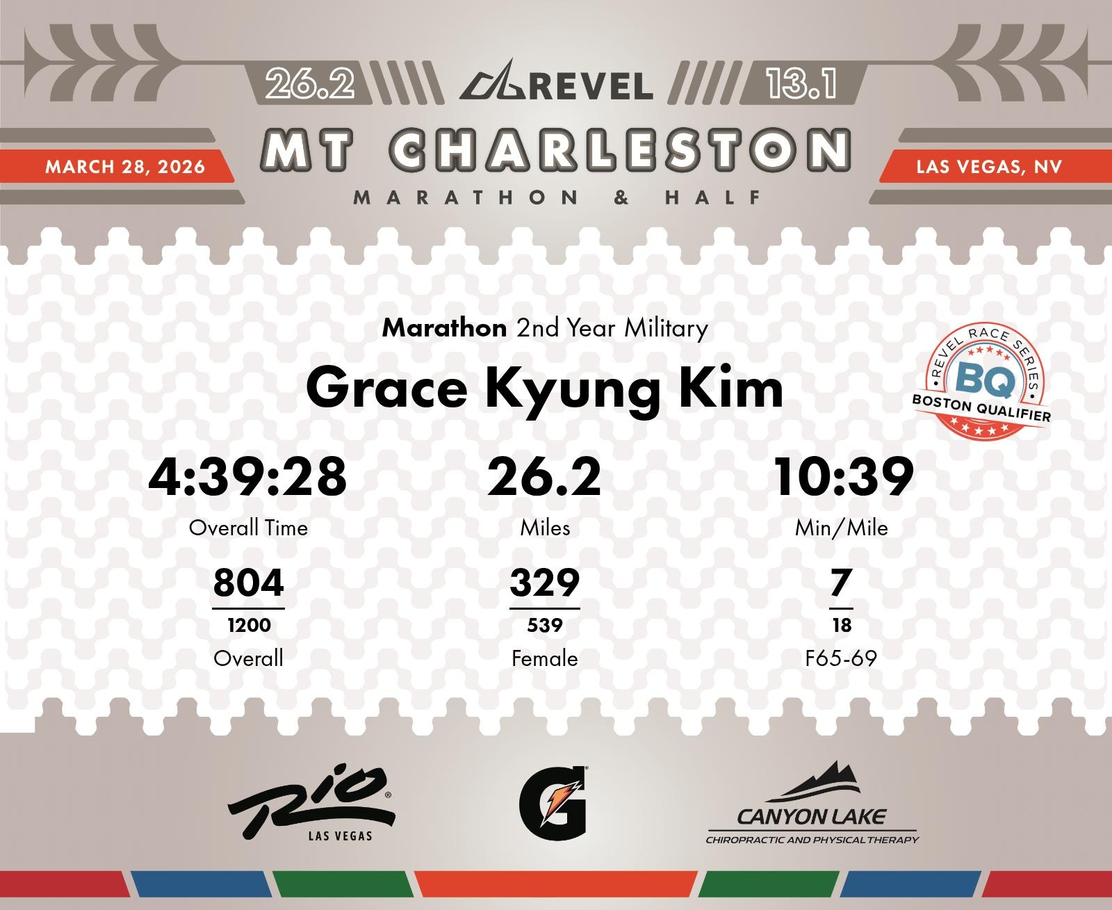 Date: March 28, 2026 Participant: Grace Kyung Kim #3289 Race: 2026 REVEL Mt Charleston Marathon Distance: 26.2 miles Weather: Unseasonably warm. Nice running temperatures at the start.