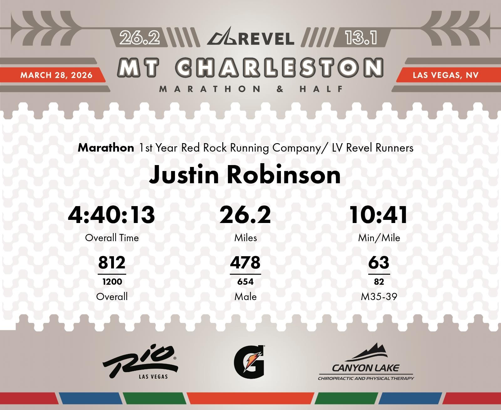 Date: March 28, 2026 Participant: Justin Robinson #3679 Race: 2026 REVEL Mt Charleston Marathon Distance: 26.2 miles Weather: Unseasonably warm. Nice running temperatures at the start.