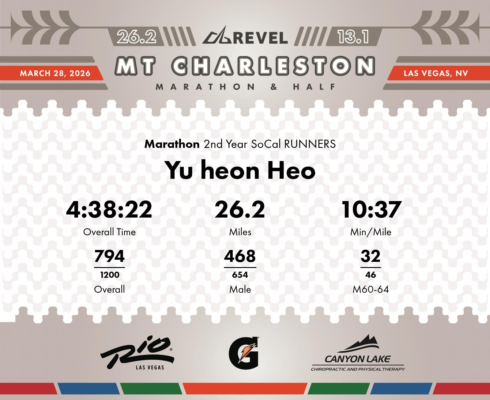 Date: March 28, 2026 Participant: Yu heon Heo #3178 Race: 2026 REVEL Mt Charleston Marathon Distance: 26.2 miles Weather: Unseasonably warm. Nice running temperatures at the start.