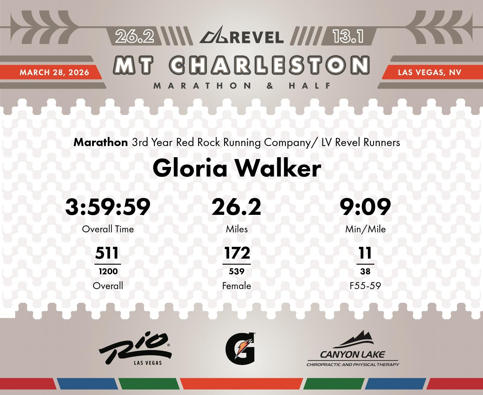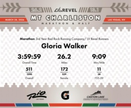 Date: March 28, 2026 Participant: Gloria Walker #3945 Race: 2026 REVEL Mt Charleston Marathon Distance: 26.2 miles Weather: Unseasonably warm. Nice running temperatures at the start.