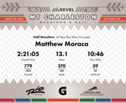 Date: March 28, 2026 Participant: Matthew Moraca #1881 Race: 2026 REVEL Mt Charleston Half Marathon Distance: 13.1 miles Weather: Unseasonably warm. Nice running temperatures at the start.