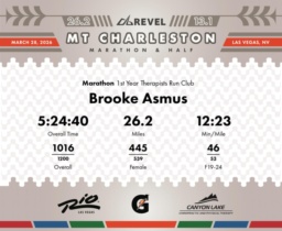 Consistent Effort, Strategic Finish Brooke maintained a steady pace throughout the 2026 REVEL Mt Charleston Marathon, clocking in at 5:24:40 for the entire 26.2 miles. Her average pace was 12:23 min/mile. Notably, she started strong with a pace of 10:38 min/mile in the first mile, initially placing 39th in her division. A remarkable recovery was shown in mile 10 with a split pace of 11:08 min/mile, holding her position efficiently in the latter half of the race. Her consistent pace is highlighted with her finish placement of 46th in the F19-24 division. In terms of split strategy, Brooke handled the various shifts in pace well, adjusting as needed and finishing with a notable final mile pace of 12:16 min/mile. The strategic decision to maintain a steady pace in the earlier sections contributed to an even distribution of effort. Consider incorporating varied pace training sessions to enhance flexibility in pacing for future races. Well done representing the Therapists Run Club!